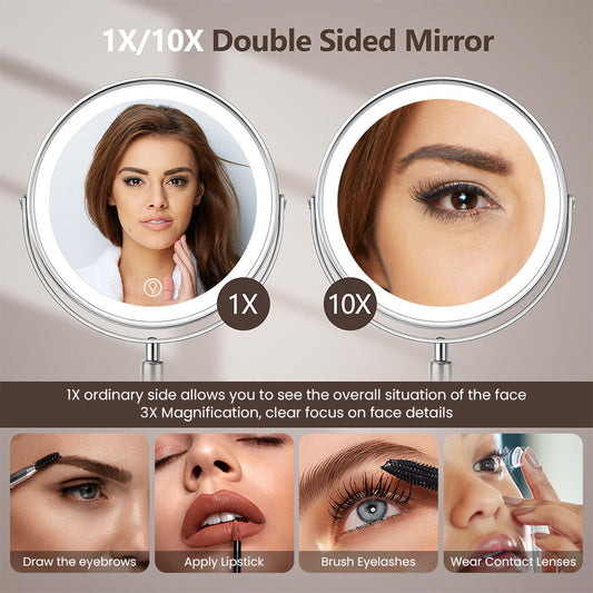 Lighted Makeup Mirror with 1X&10X Magnification, 8" Height Adjustable Double Sided Mirror, 360°Rotation Touchscreen Make up Mirror, 3 Colors LED Light Brightness Adjustable Vanity Mirror, Chrome